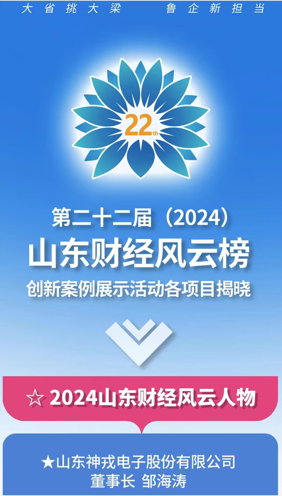 鄒海濤董事長榮獲“第二十二屆(2024)山東財經(jīng)風(fēng)云人物”[ 更多 ]